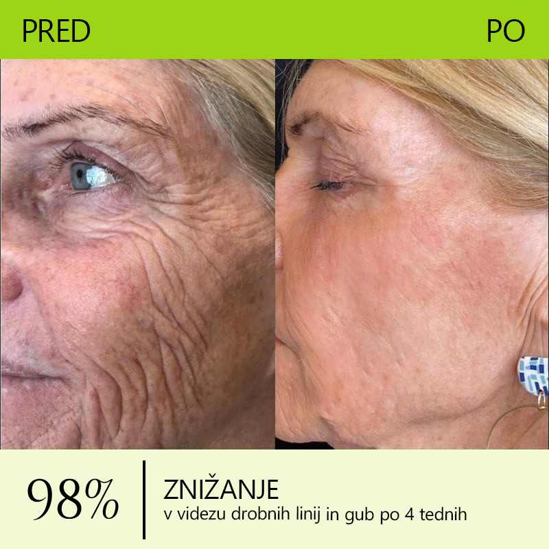 Kliniฤno dokazanoย ย โ dvojno slepe ลกtudije kaลพejo doย ย 93 % zmanjลกanje gub v samo 3 dnehย ย na 4 celinah. -