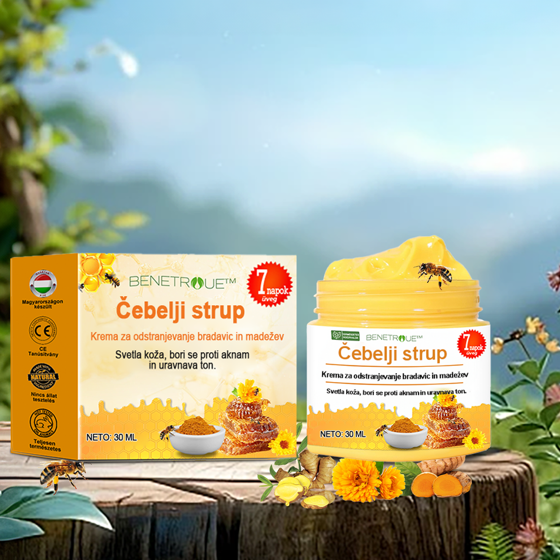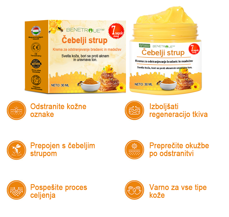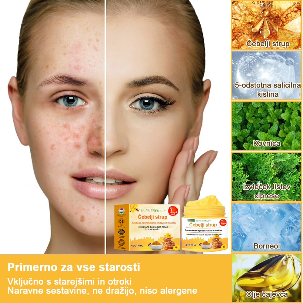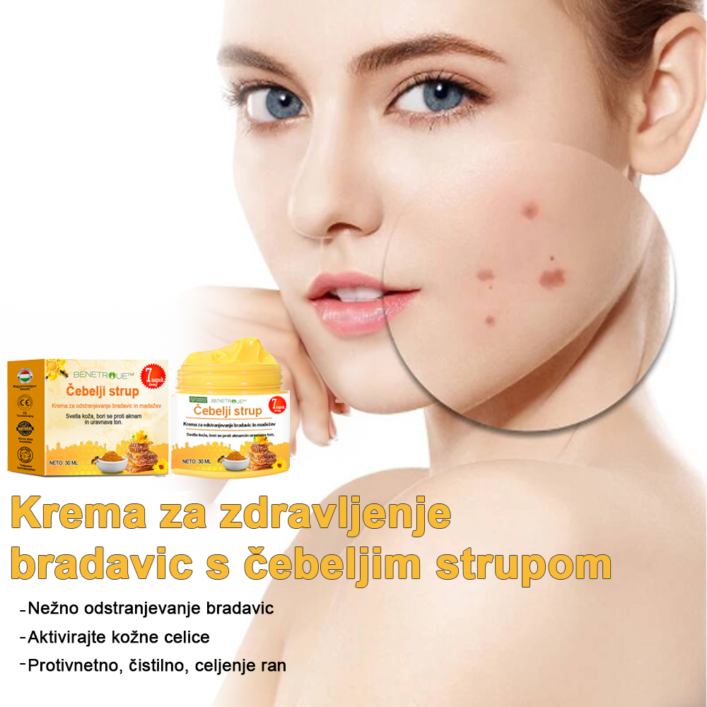 BENETURE™ krema za odstranjevanje čebeljega strupa in znamenj ponuja rešitev, ki uporablja moč čebeljega strupa za učinkovito zdravljenje različnih kožnih madežev, kot so kožne oznake, rojstna znamenja, bradavice in kožni madeži. Ta napredna formula, obogatena z aktivnimi sestavinami, pridobljenimi iz čebeljega strupa, raztopi in nežno odstrani neželene izrastke.