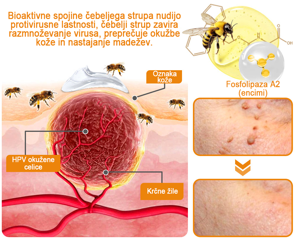 Čebelji strup: Čebelji strup je strup novozelandskih čebel. To je metoda spodbujanja čebel k izločanju čebeljega strupa z etrsko anestezijo. Ta naravna snov ni smrtno nevarna in je znana po potencialnih koristih pri zdravljenju različnih bradavic in različnih kožnih stanj. Lahko uravnava imunski odziv in zavira provnetne citokine. Čebelji strup je razmeroma varen imunomodulator s protivirusnimi lastnostmi. Zato lahko učinkovito zdravi tudi virusno okužene bradavice in učinkovito uniči kožne celice bradavic, kar jim omogoči, da postopoma spremenijo barvo, potemnijo in nato v 1-2 tednih odpadejo. Melitin, ki ga je odkrila naša ekipa, ima tudi močne protivnetne lastnosti in pomaga zmanjšati vnetje, povezano z bradavicami.