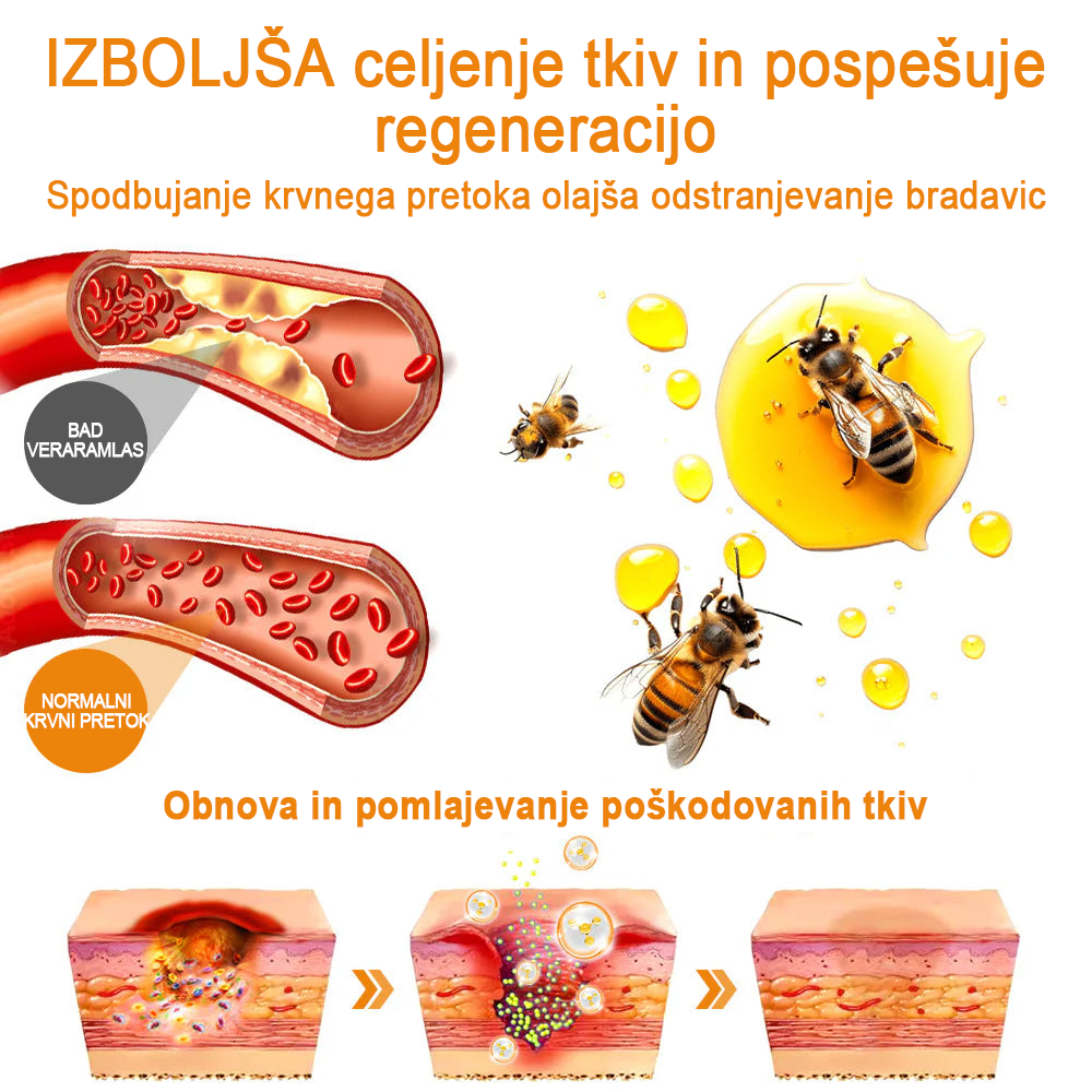 Druga pomembna prednost čebeljega strupa je njegova sposobnost spodbujanja krvnega obtoka. S spodbujanjem krvnega pretoka na ciljnem območju spodbuja odstranjevanje kožnih madežev ali bradavic, hkrati pa spodbuja regeneracijo tkiva in pospeši proces celjenja. To pomaga obnoviti in revitalizirati poškodovana tkiva.