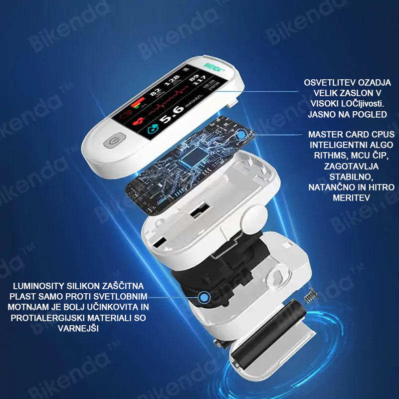 Silikonska obročasta zaščita pred svetlobo in hitro merjenje: Naprava Bikenda™ ima silikonsko obročasto zaščito pred svetlobo, ki izboljša prileganje prstom in zmanjša motnje zaradi svetlobe iz okolja. Ta oblika zagotavlja bolj občutljive meritve z rezultati, prikazanimi v samo 5 sekundah.