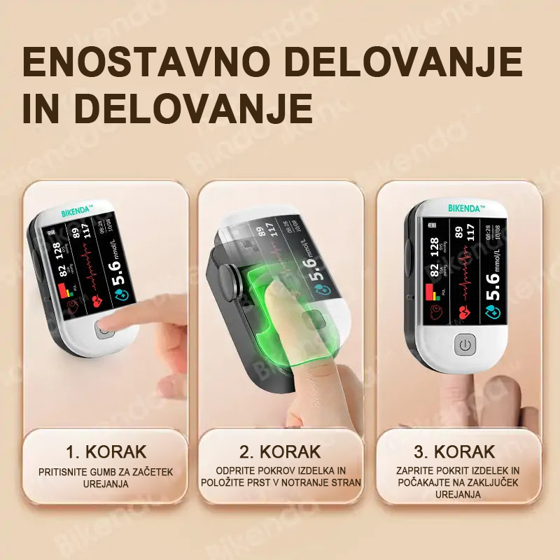 Patentirana oblika Bikenda™: Enostaven za uporabo, zagotavlja optimalno funkcionalnost in izjemno uporabniško izkušnjo. NEBOLEČA IN NEINVAZIVNA MERITEV Preprosto vstavite prst in pritisnite za aktiviranje. Postopek je neboleč in neinvaziven, zaradi česar je idealen za merjenje in spremljanje ravni krvnega sladkorja pri starejših kadarkoli doma. Prav tako je izjemno priročen za dnevno spremljanje zdravja.