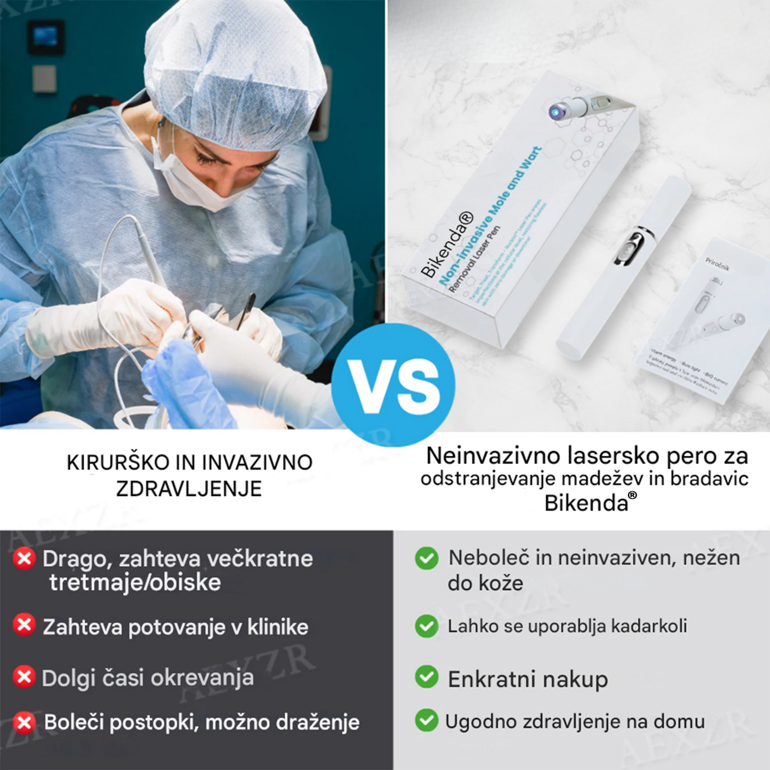 ✅ Da! Bikenda® je odobrena s strani FDA in CE, testirana je pri dermatologih in je zasnovana za varno, nebolečo in neinvazivno domačo uporabo. Zagotavlja rezultate na profesionalni ravni brez tveganja operacije in močnih kemikalij.