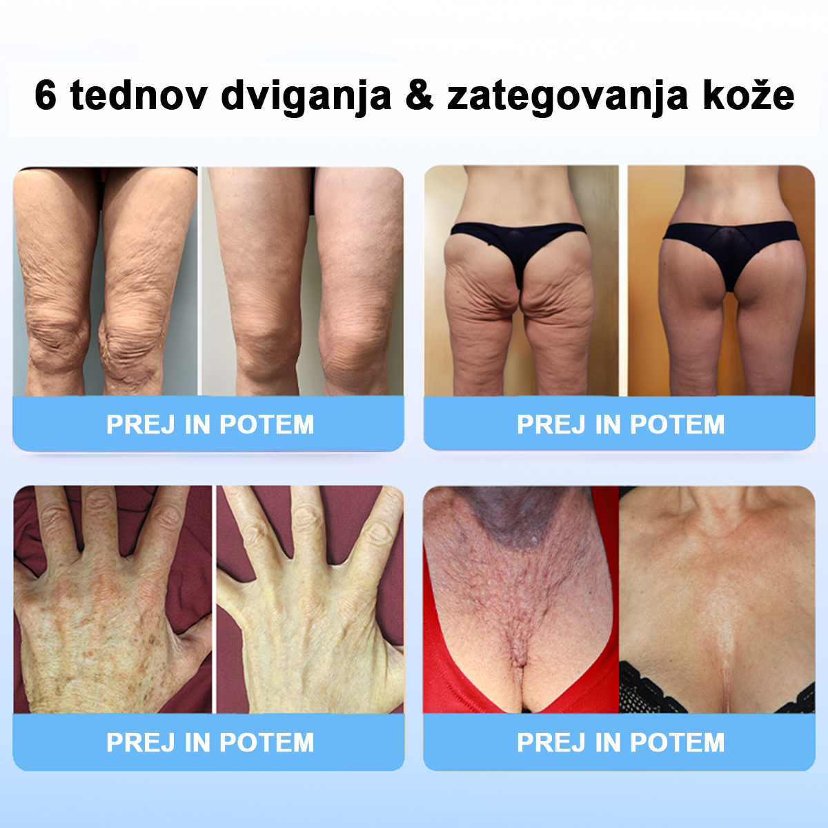 Razpokana koža – Moja stegna so se začela gubati, ko sem dopolnila 30 let, ohlapna koža pa je značilna za mojo družino. Vedno sem se trudila, da bi to sprejela, a po izgubi teže je postalo slabše. Koža se je začela povešati in združevati kot sveženj A4 papirja. Kadarkoli nosim kratka oblačila, ljudje strmijo v moje gube. Zdaj sem star 50 let in nenehno strmenje me spravlja v stres in me spravlja v zadrego. Toda našel sem izdelek, ki resnično deluje. Drugačna je od učvrstitvenih krem, ki sem jih kupila na Amazonu. Rezultati so hitri in opazni. Dobil sem ga pred mesecem dni in takoj začel uporabljati. Nanesem ga trikrat na dan, še posebej po tuširanju. Poglejte moje fotografije: zdaj so popolnoma drugačne. Moje noge so čvrste in gladke, izginila je tudi povešena koža na vratu in rokah. Želim si, da bi mu dal 10 zvezdic. Res deluje 💯 Moral bi ga kupiti. Vreden je vsakega penija in zagotovo bom kupil več.