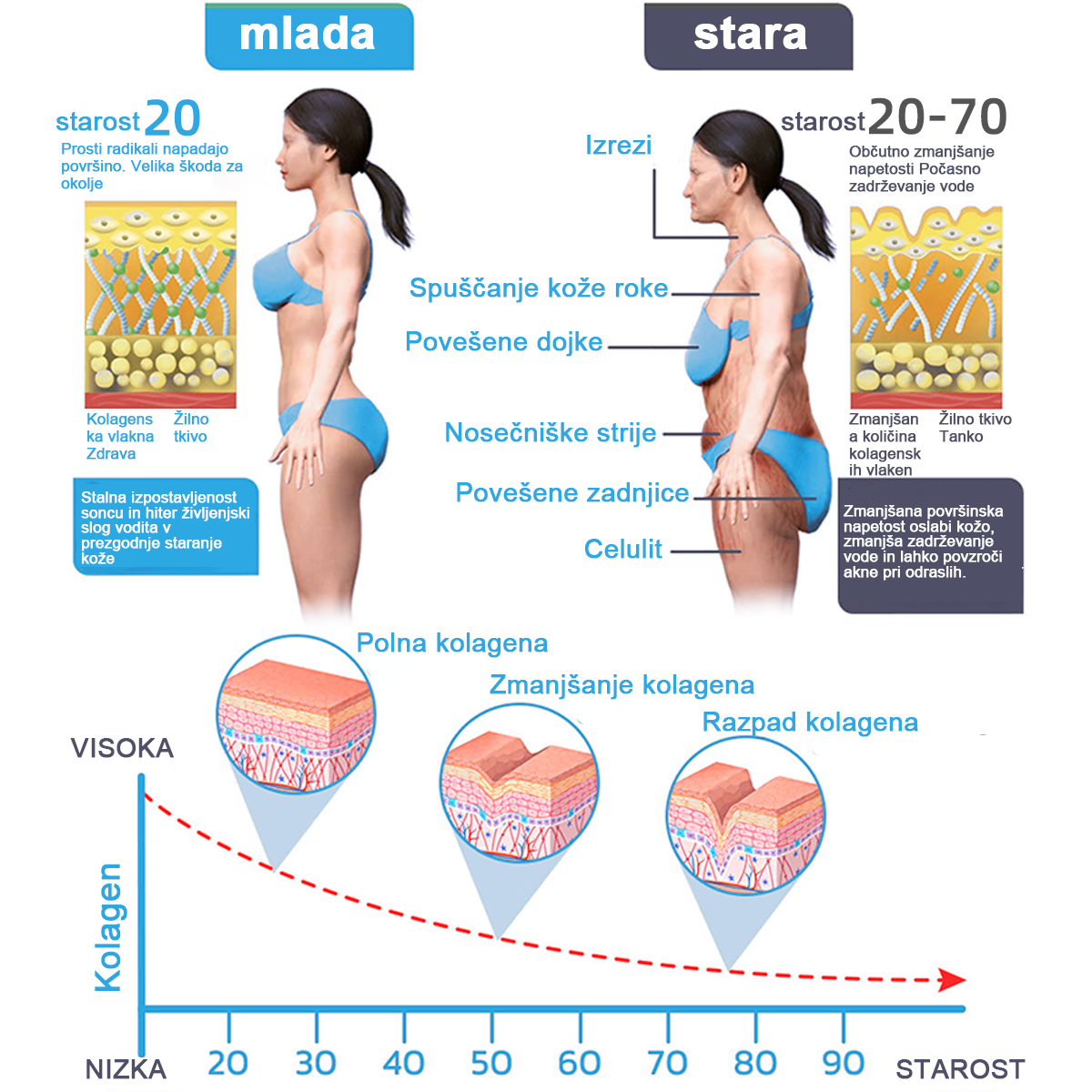 Proces staranja povzroči, da telo izkusi svoje naravne učinke, ki se običajno začnejo okoli 25. leta starosti. Ta pojav vključuje zmanjšanje proizvodnje kolagena, ki je bistvenega pomena za ohranjanje strukture kože, in zmanjšanje elastičnosti ali razgradnjo elastina , ki spodbuja odpornost kože. Te spremembe so običajno bolj opazne pri ženskah. Poleg tega lahko pride do zamude pri odstranjevanju odmrlih kožnih celic in rahlega zmanjšanja proizvodnje novih kožnih celic, kar lahko vodi do povešenosti in gub na različnih delih kožnega tkiva.