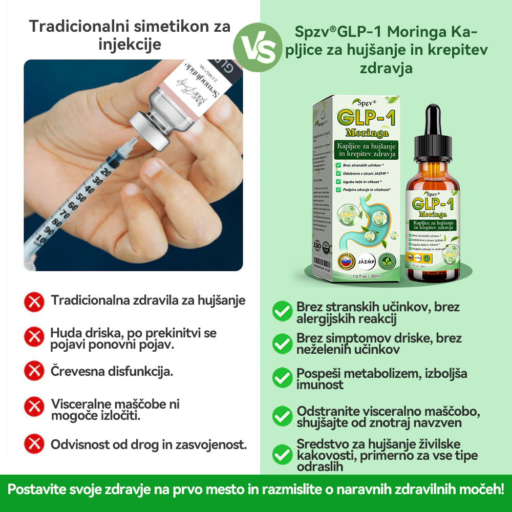 Kapljice 𝐒𝐩𝐳𝐯® so obogatene z moringo, naravnim superživilom, ki pospešuje presnovo, spodbuja kurjenje maščob in pomaga uravnavati krvni sladkor, hkrati pa izboljšuje zdravje sklepov in kosti ter povečuje splošno vitalnost. Glede na raziskave FDA kombinacija Moringe in GLP-1 zagotavlja celovitejšo podporo za splošno zdravje.