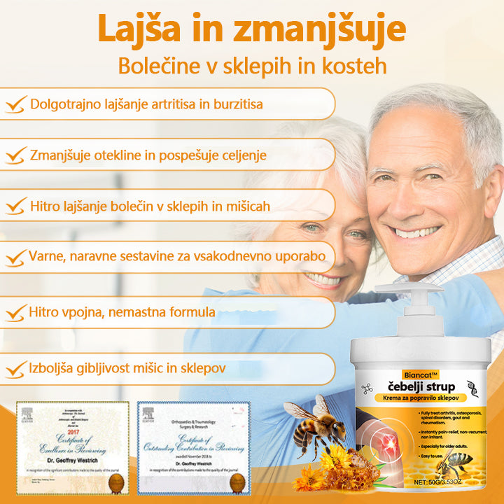 Krema za obnovo sklepov Biancat™ s čebeljim strupom zagotavlja hitro in učinkovito lajšanje artritisa, protina, osteoartritisa in bolečin v sklepih – povrne prožnost in izboljša gibljivost.