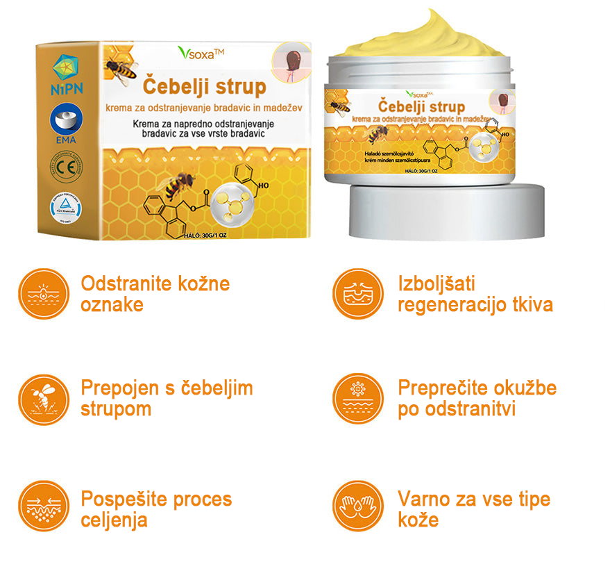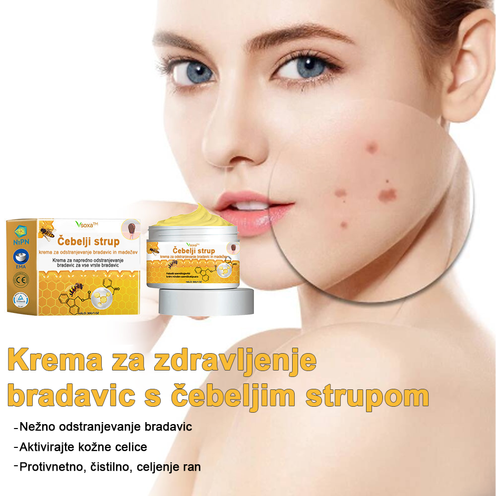 ฤebelji strup: ฤebelji strup je strup novozelandskih ฤebel. To je metoda, s katero se ฤebele spodbudi k izloฤanju ฤebeljega strupa z uporabo etrske anestezije. Ta naravna snov ni ลพivljenjsko nevarna in je priznana zaradi svojih potencialnih koristi pri zdravljenju razliฤnih bradavic in razliฤnih koลพnih bolezni. Uravnava lahko imunske odzive in zavira citokine, ki spodbujajo vnetja. ฤebelji strup pa je razmeroma varen imunomodulator s protivirusnimi lastnostmi. Zato lahko uฤinkovito zdravi tudi virusne infekcijske bradavice in uฤinkovito uniฤuje koลพne celice bradavic, zaradi ฤesar te postopoma spremenijo barvo, potemnijo in nato v 1-2 tednih odpadejo. Melittin, ki ga je odkrila naลกa ekipa, ima tudi moฤne protivnetne lastnosti, ki pomagajo zmanjลกati vnetja, povezana z bradavicami.